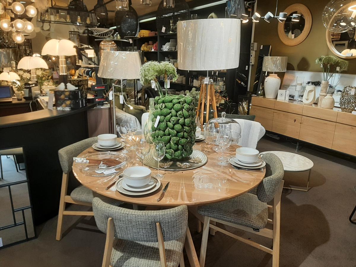 Créez une ambiance fraîche et élégante avec cette sélection de meubles et décorations. Une table ronde en bois naturel, accompagnée de chaises confortables et d'une vaisselle épurée, invite à des moments conviviaux. Le tout est sublimé par des touches végétales et des luminaires doux, parfaits pour une atmosphère chaleureuse et accueillante.